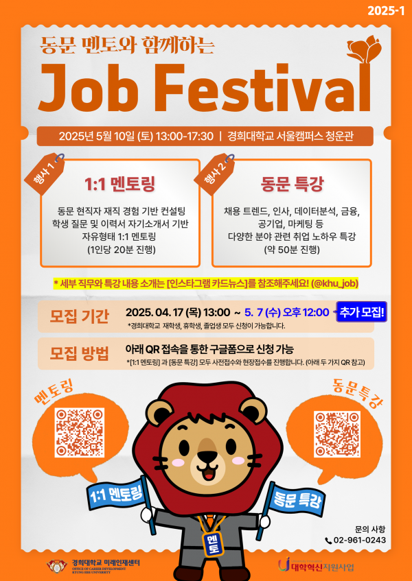 일반 | [미래인재센터] 2025 상반기 동문 멘토와 함께하는 경희대학교 Job Festival 안내 페이지 정보 작성자 : 의과대 작성일 : 2025-04-29 조회 : 282회 관련링크 본문 이전글 다음글 목록