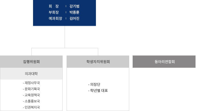 이를 위해 저희 학생회는 학생회장/부회장으로 운영진을 구성하였습니다. 각 운영진은 운영 목적에 따라 처부를 구성하였으며 각 처부의 구성원은 학생회 임원과 학년 대표로 이루어져 있습니다.